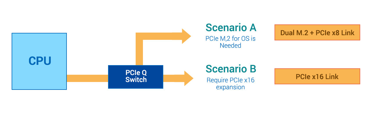 系统可切换设计可视需要将 PCI Express® (PCIe®) 通道导向至 M.2, PCIe 4.0 插槽或 NVMe 硬盘,以提供更大性能与容量。